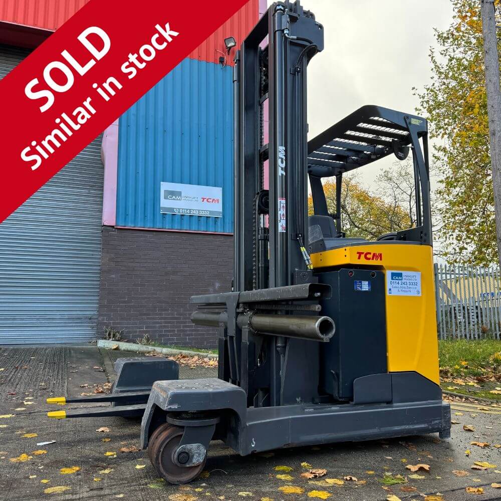 This TCM UFW250DTFVRE635 is a 2500kg Electric powered four-way reach truck fitted with a 6350mm full free lift triplex mast and integral fork spreader attachment. This machine has our 4* bodywork condition rating (Great) and is part of our “Nearly New” range having clocked up under 300 working hours in it’s lifetime from new.