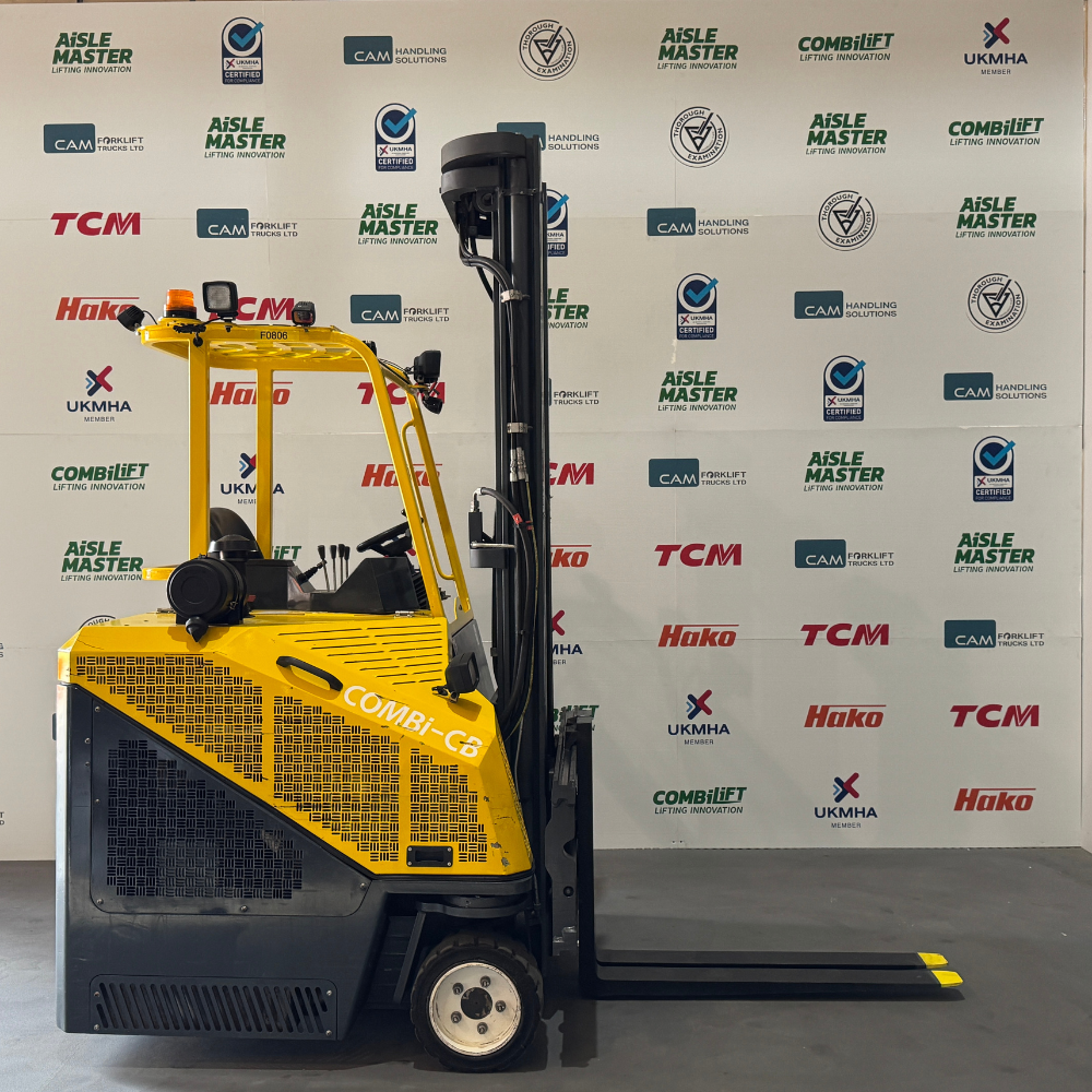 This Combilift CB3000 is a 3000kg LPG powered multi-directional counterbalance truck fitted with a 6500mm full free lift triple mast, complete the an integral side-shifting fork positioner attachment.