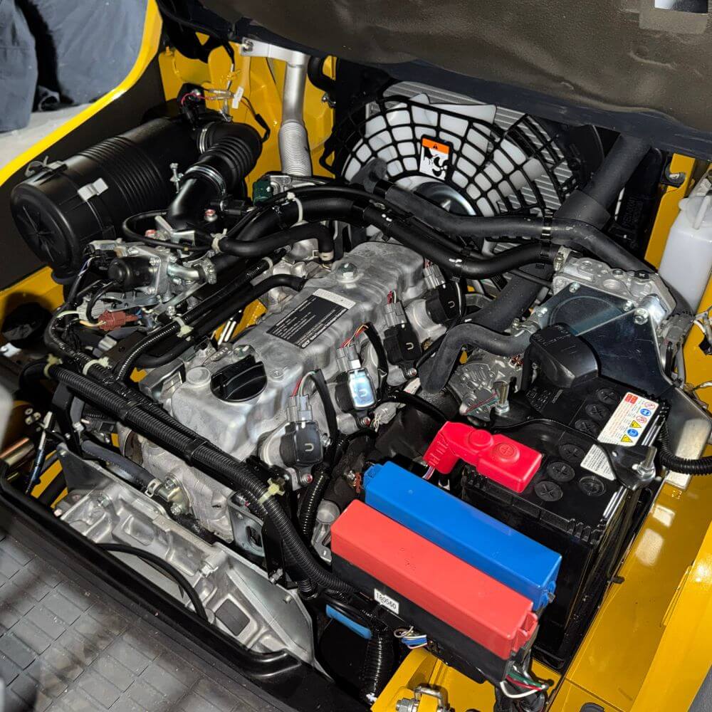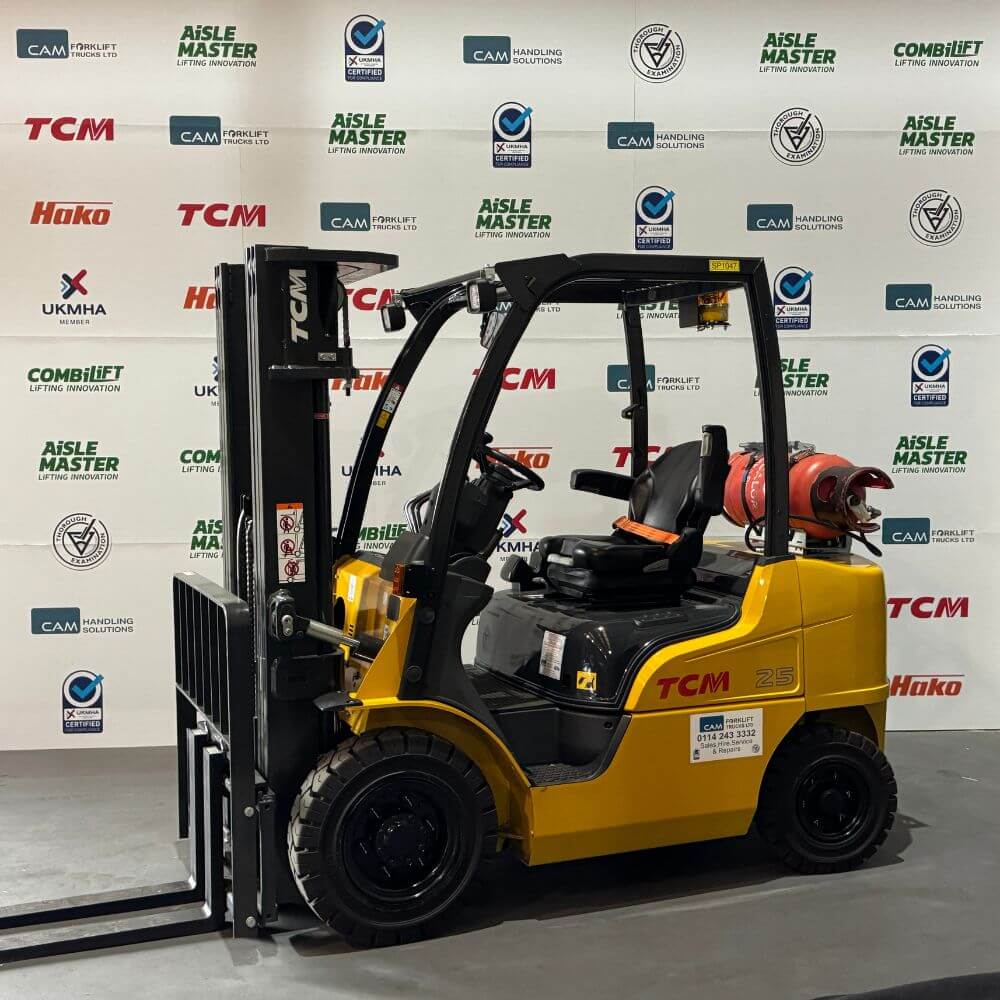 This as-new 2022 TCM FGE25-E2 is an LPG forklift fitted with a container spec mast and sideshift. The LPG engine meets Euro Stage V requirements, recirculating the exhaust gas back through the system after cooling to limit harmful emissions.