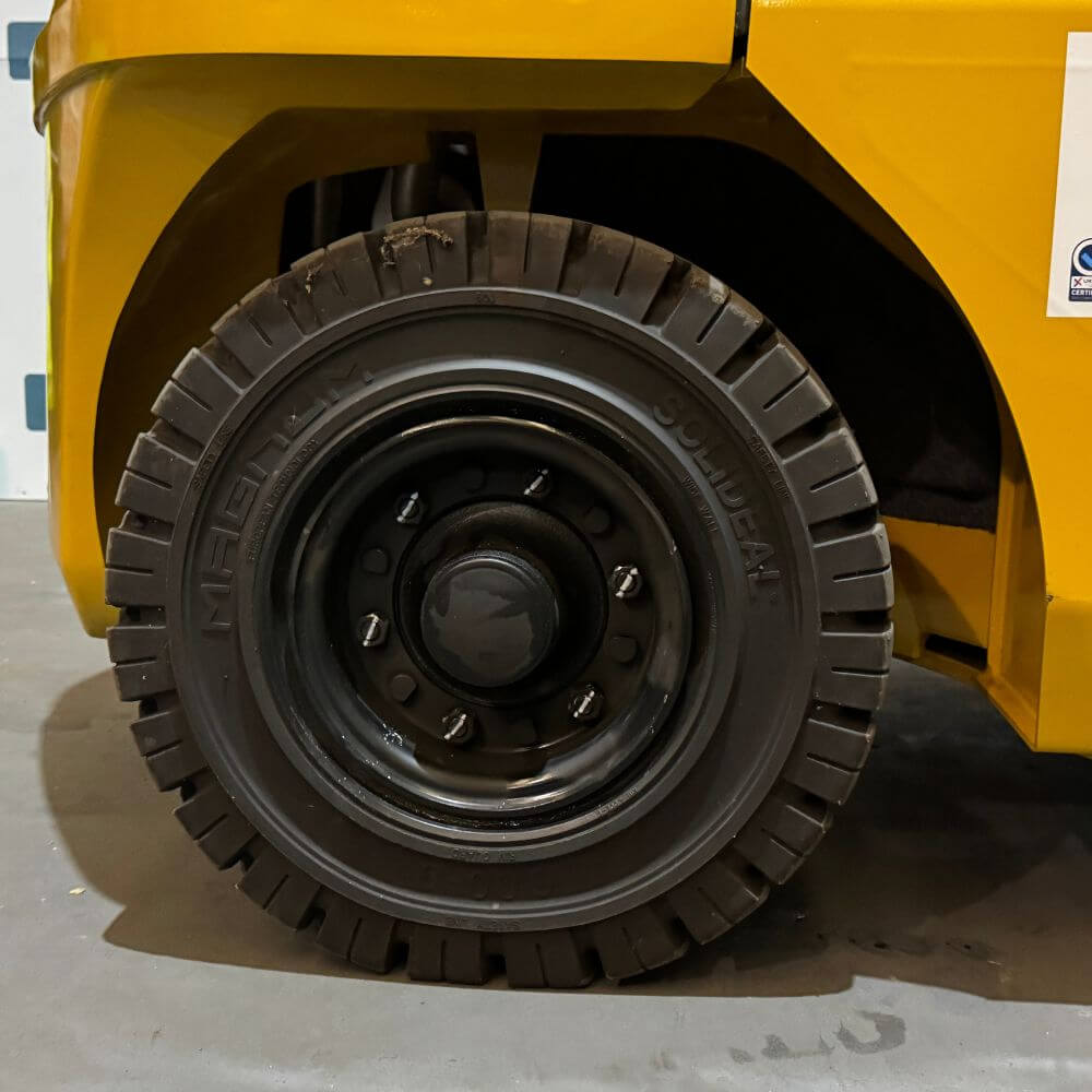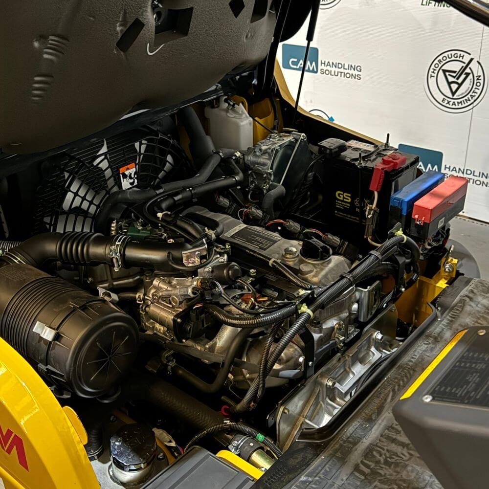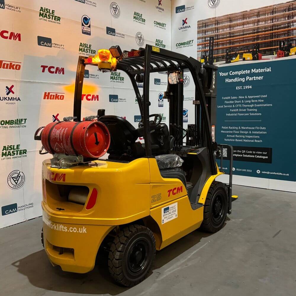 This as-new 2022 TCM FGE25-E2 is an LPG forklift fitted with a container spec mast and sideshift. The LPG engine meets Euro Stage V requirements, recirculating the exhaust gas back through the system after cooling to limit harmful emissions.