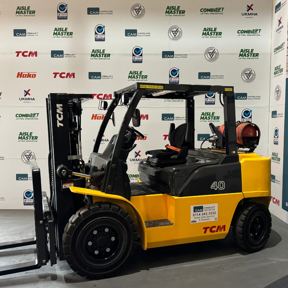 This TCM FGE40-E1 is a 4000kg LPG-powered counterbalance forklift truck with a container spec 3850mm triple mast, hook-on sideshift attachment, and a low clearance overhead guard for heavy-duty container work.